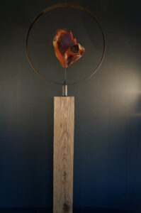 Red Galastone in stalen ring op massief eiken sokkelH: 200 cm B: 60 cmBinnen/buitenbeeld met vorst een plastic zak erover [voor de zekerheid]