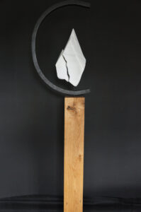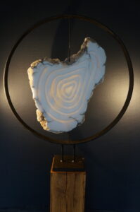 Albast in stalen cirkel op massief eiken sokkel