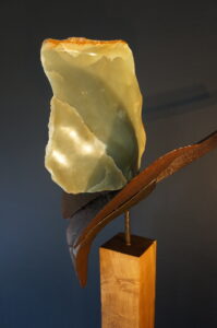 Materiaal: Jade in stalen frame op massief eiken sokkel.